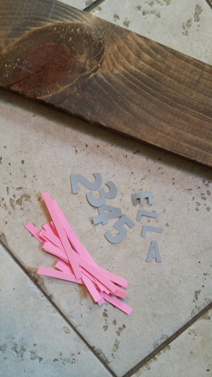 I used a Cricut to cut the lines, numbers, and letters that I will use to glue onto the piece of wood.